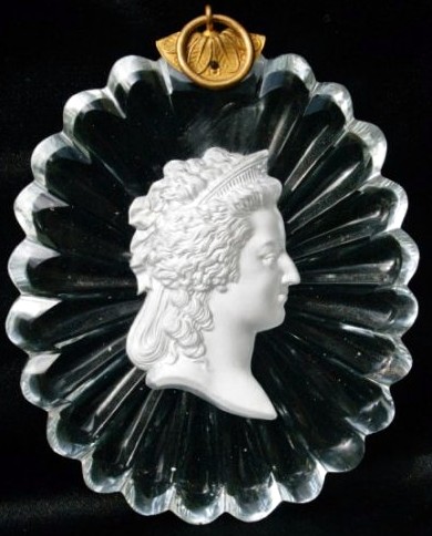 Grand médaillon en cristal taillé à fond rayonnant centré d'un cristallo cérame au profil de Marie-Antoinette. Anneau en bronze doré à décor de feuillages et rosaces. Premier tiers du XIXe siècle. Haut. : 14,2 cm - Larg. : 11,5 cm. Estimé 400€ à 500€, il a été vendu aux enchères 3200€ début 2010 |