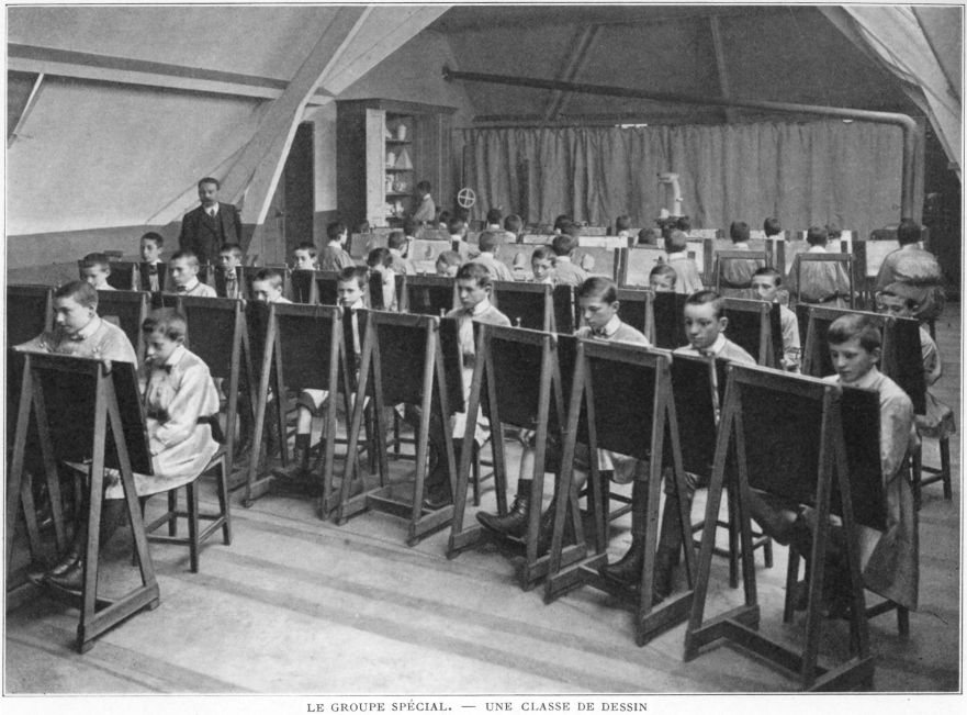 Groupe Préparatoire. - Le concours d'admission au Groupe Spécial, avec la limite d'âge qu'il comporte, fait, parmi les élèves des Groupes Élémentaires Schneider et des Écoles primaires communales, une forte sélection et ne retient que les sujets susceptibles de devenir des ouvriers d'élite, des employés et des ingénieurs.