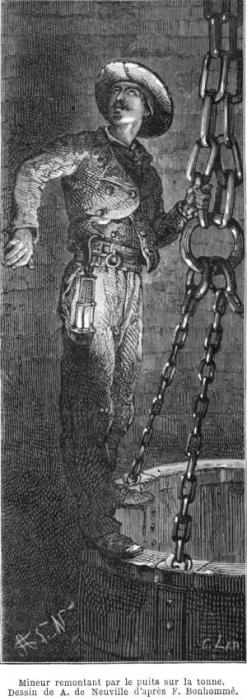 Naguère, la descente dans un puits de mine était pleine de péripéties. Suspendu au bout du câble, dans une tonne aux douves mal jointes, on allait battant contre les parois, parfois accroché par la tonne montante, craignant une chute de pierre ou d'outil, baigné par l'eau qui suintait de la roche, enfin, sujet à mille accidents.