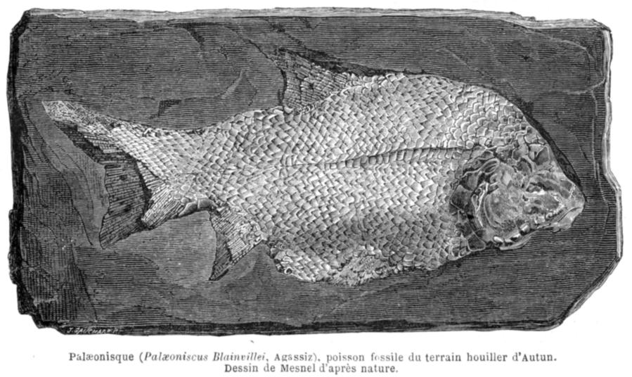 C'est dans leurs feuillets qu'on rencontre les empreintes de poissons fossiles, les amblyptères, les paléonisques sur lesquels le naturaliste Agassiz a fait les grands travaux qui ont rendu son nom à jamais immortel. C'est encore au milieu de ces schistes, à Muse, que M. Frossard a récemment découvert les débris pétrifiés d'un saurien, le premier qu'on ait trouvé en France dans le terrain houiller. M. A. Gaudry en présentant à l'Académie des sciences ce noble témoin des premiers âges, parent de l'Archégosaure ou du premier lézard, a proposé de lui donner le nom d'Actinodon. Ce nom signifie que les dents de ce reptile sont striées, rayonnées (Il faut toujours parler quelque peu la langue d'Homère, dans la science comme dans l'industrie. Actinodon vient de deux mots grecs: rayon, etdent. Je m'étais fait une joie de communiquer aux lecteurs du Tour du Monde un dessin fait, d'après nature, des vénérables débris de l'Actinodon. Malheureusement le muséum de Paris n'est pas prêteur, même de ce qu'on lui prête, et c'est là son moindre défaut. Comme il se propose de publier lui-même le fossile trouvé par M. Frossard, il m'a renvO\é à l'ancien éditeur des Archives du muséum, celui-ci au nouvel éditeur, lequel m'a renvoyé à son tour aux administrateurs eux-mêmes du muséum, lesquels, après m'avoir enfermé dans ce cercle vicieux et le règlement du Jardin des plantes à la main, m'ont ajourné à l'issue de leur publication de l'Actinodon. J'ai ainsi couru de Caïphe à Pilate, et suis revenu les mains vides. Ce que les établissements administratifs ne font que lentement, et souvent à grands frais, un simple éditeur l'eut fait en quinze jours et sans rien demander à l'État. Et nunc erudimini !)